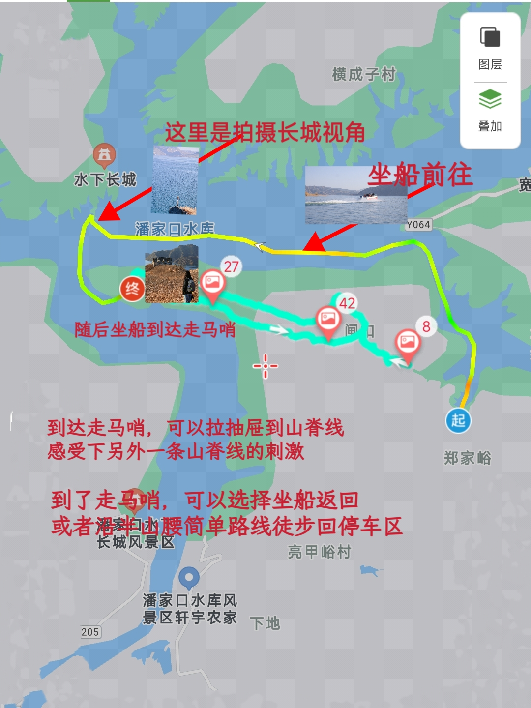 【活动强度】 初级强度,坐船前往水上长城、走马哨,半山腰徒步返回,全程约8km,累计爬升300m